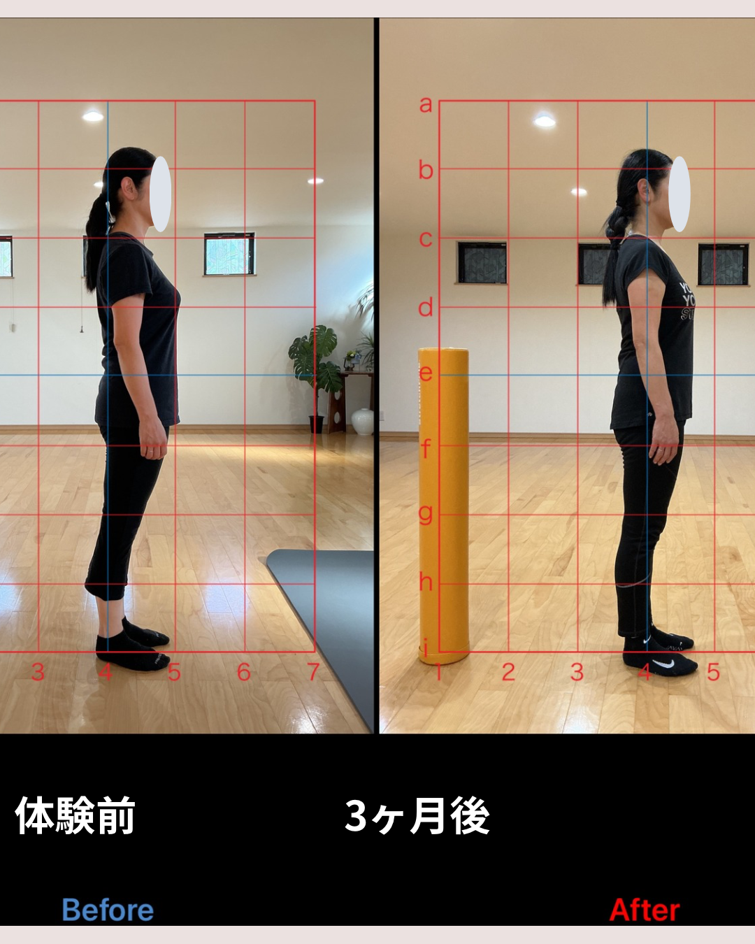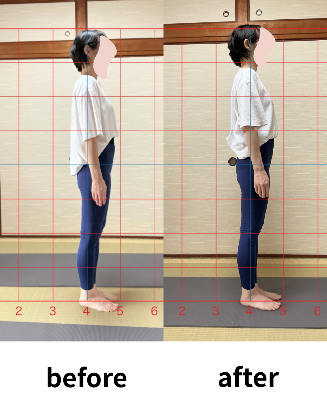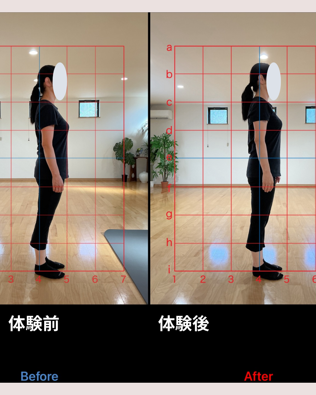 体験レッスン前はお尻の方にあった重心線(青い線)がレッスン後には太ももの中心に✨