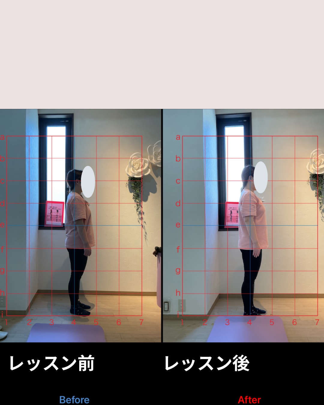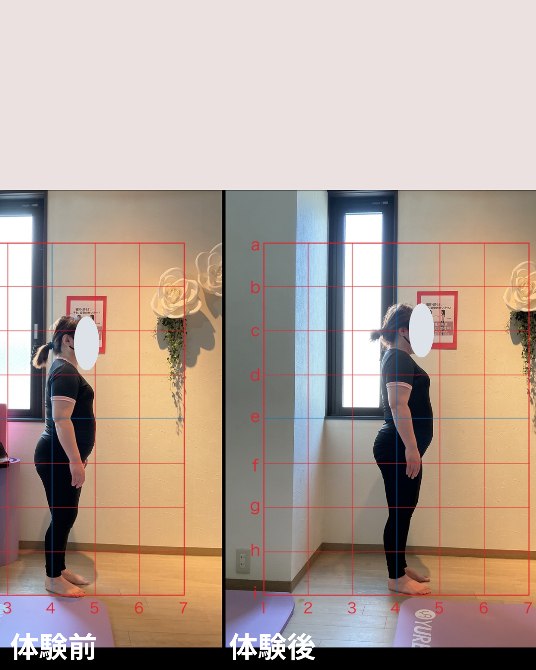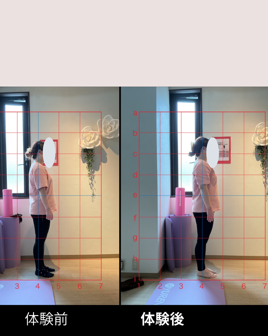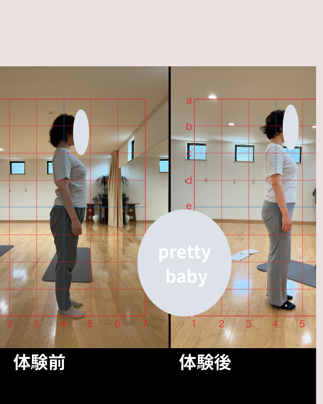体験レッスン前はお尻の方にあった重心線(青い線)がレッスン後には太ももの中心に✨