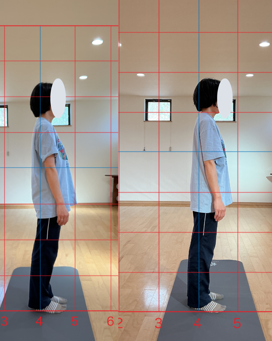週1回を3ヶ月継続されて、耳の後ろにあった重心線(青い線)が耳の真ん中に✨